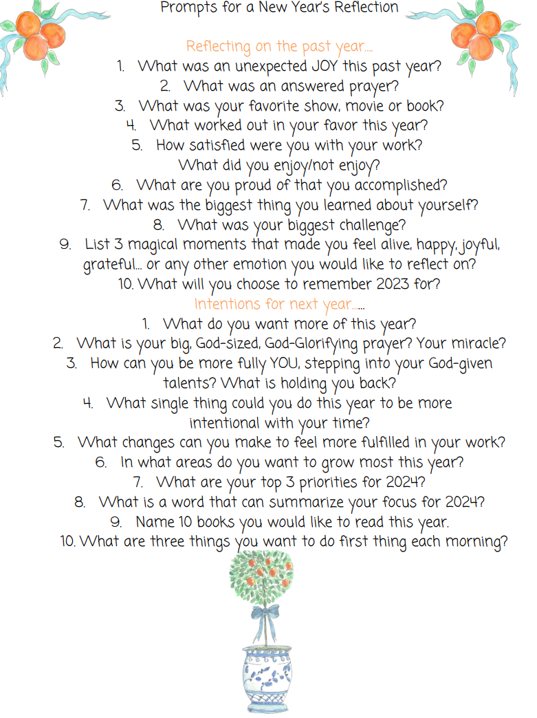 Take some time to reflect on what the goals are for 2024…. What is important to you and important to God? What can you do differently this year or perhaps do more of from last year? Here are some prompts.